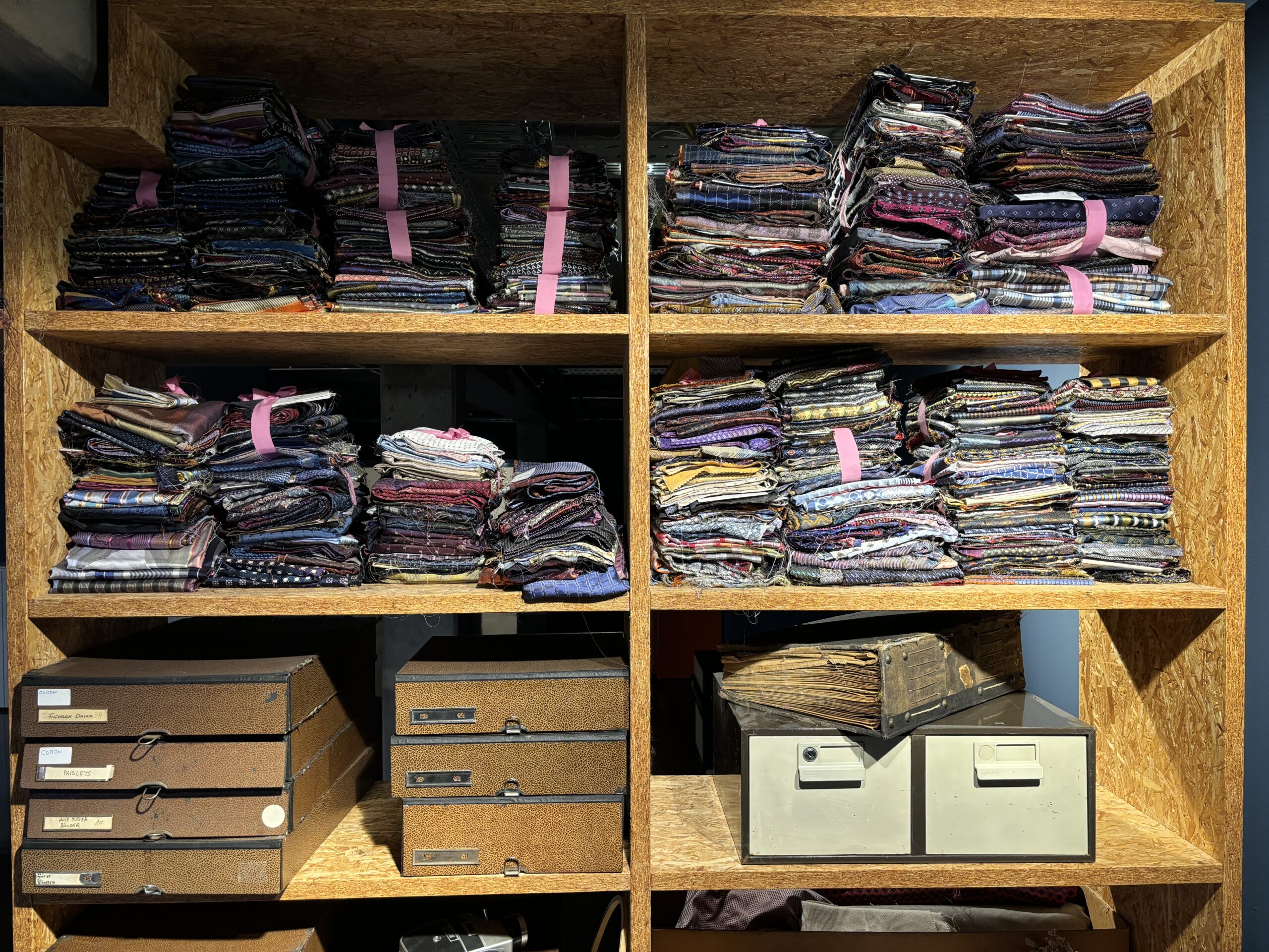 Teil unserer Inspiration ist unser großes und altes Archiv. Hier lagern alte Seidenjacquards, Drucke und handgezeichnete Dessins, die bis ins 18. Jahrhundert zurückreichen. Sie stammen aus Deutschland, Italien und Frankreich und sind ein wertvoller Teil unserer Arbeit. Auch alte, zum Teil vergessene Handwerkstechniken sind hier hinterlegt. Wir versuchen stetig, diese neu zu entdecken, in unsere Zeit zu übersetzen und in unsere Kollektionen zu integrieren.